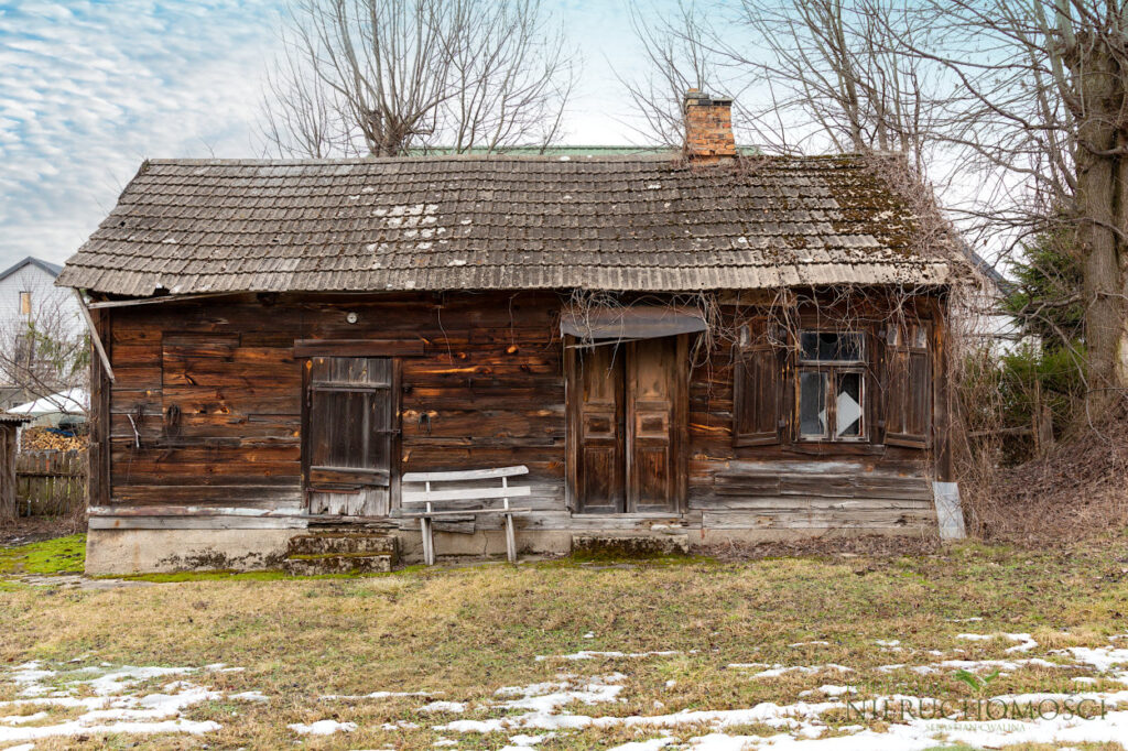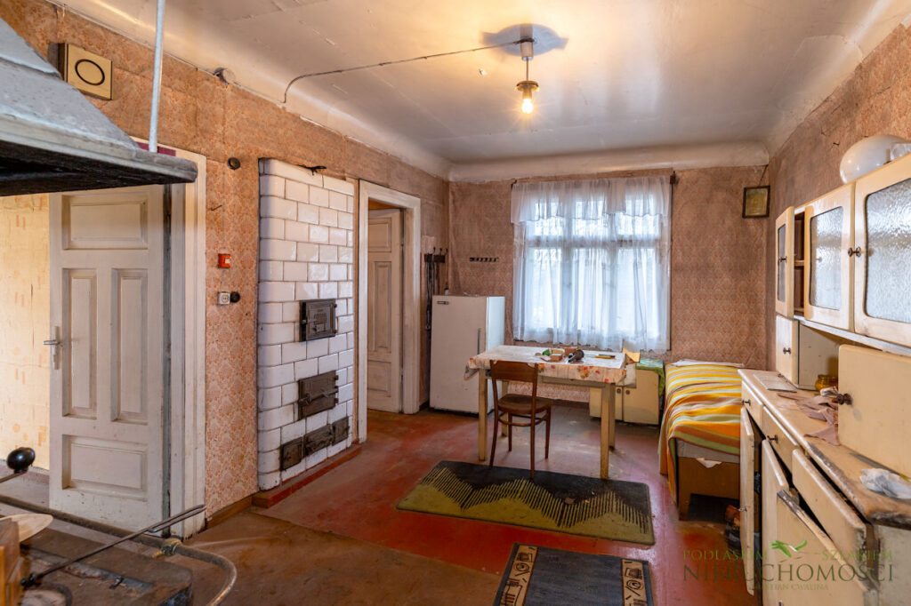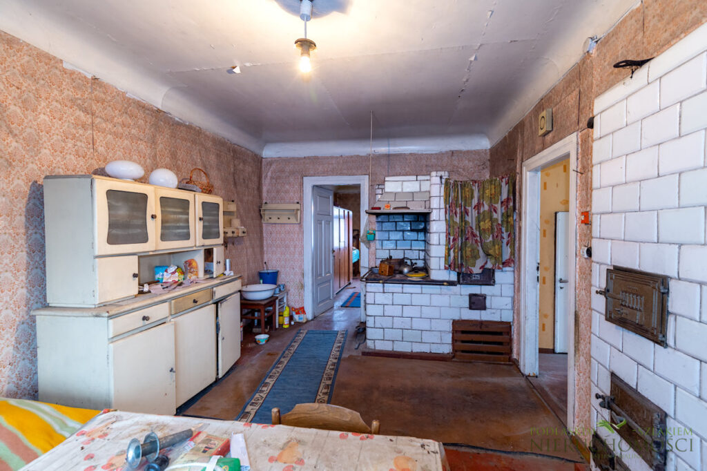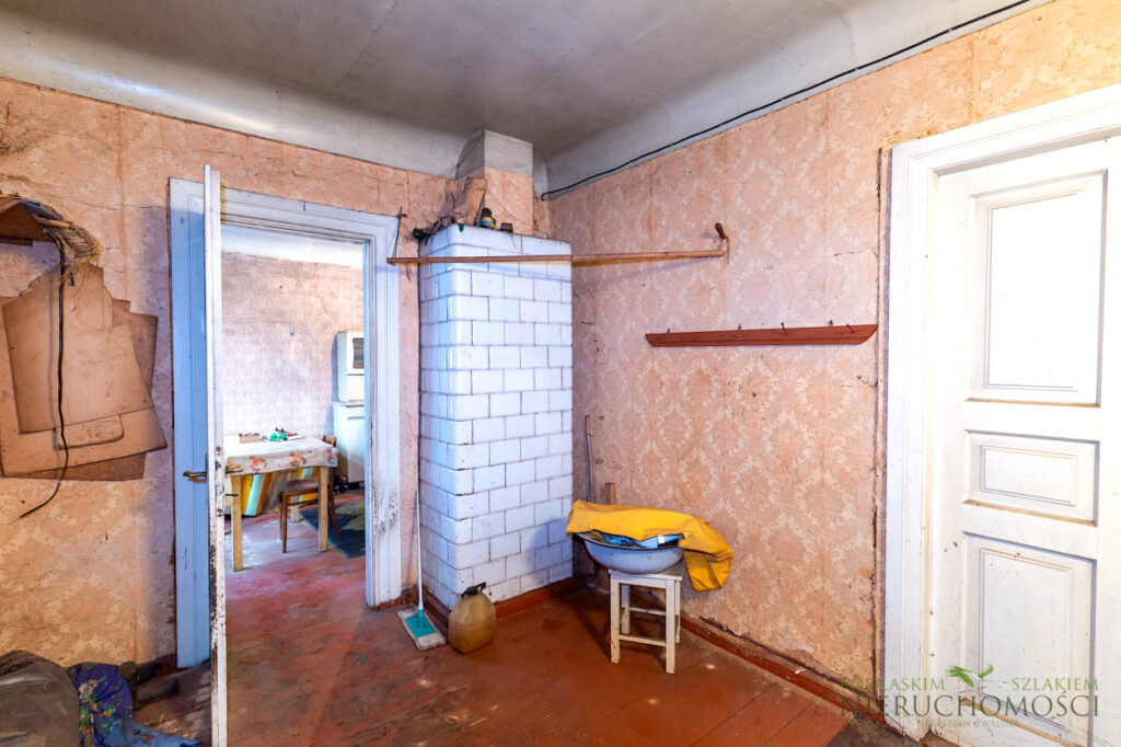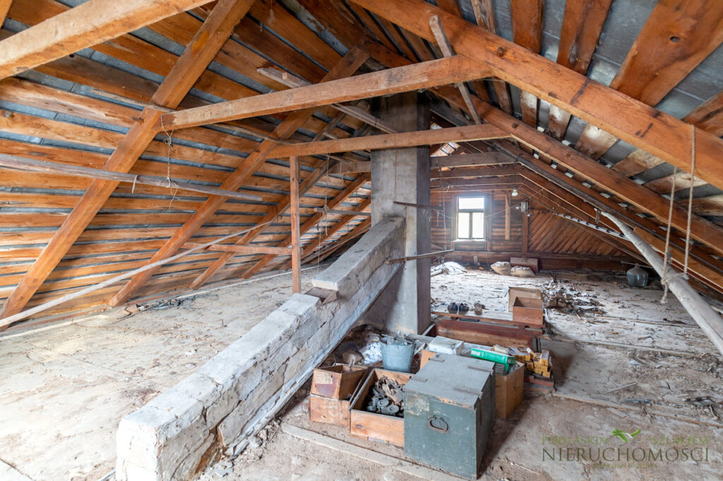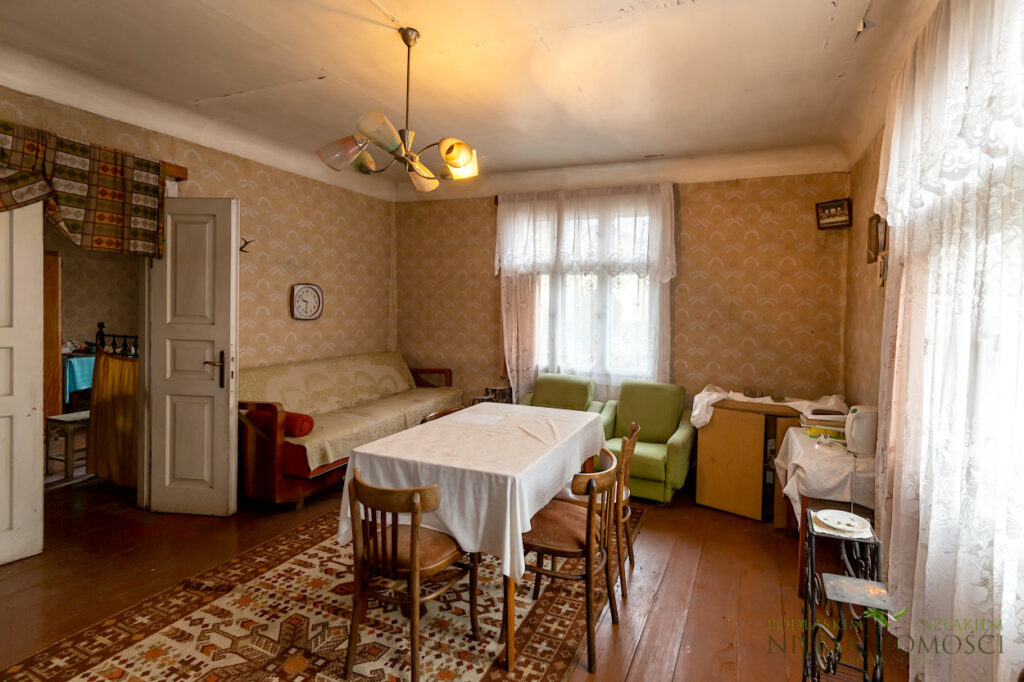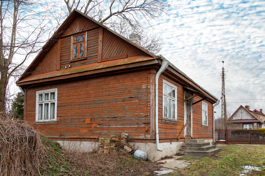 Drewniana konstrukcja budynku mieszkalnego jest z okresu lat 60-tych. Bryła budynku składa się z parteru, na którym znajduje się przedpokój, trzy (3) pokoje oraz kuchnia. Poddasze tworzy nieużytkowa otwarta przestrzeń.