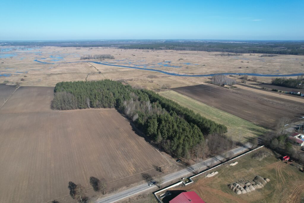 Działka porośnięta jest drzewami iglastymi i oddalona jest ok. 200 m od rzeki Narew.